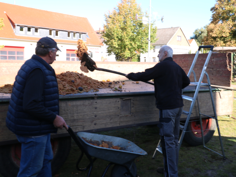 Vereinsmitglieder laden den Trester auf einen Anhänger. - Foto vom 23.09.2025