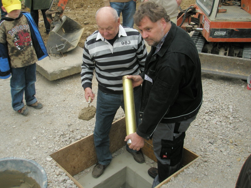 5. Juni 2009 - Grundsteinlegung: Eine Messingröhre mit Grundsteinurkunde, Tageszeitung, Münzen und weiteren Gegenständen wird im Boden vermauert.