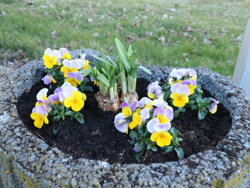 Die Blumenkübel an den Ortstafeln und der Einmündung der Bantelner Straße wurden in der vergangenen Woche mit Hornveilchen und Osterglocken bepflanzt. - Foto vom 22.03.2025