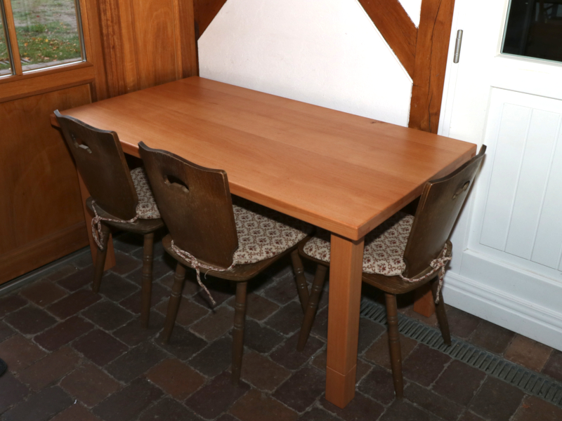 Der neue Tisch steht platzsparend im Eingangsbereich. Bei Bedarf wird er anders im Raum platziert. Noch stehen drei alte Stühle am Tisch, die in den nächsten Monaten durch neue Stühle ersetzt werden sollen. - Foto vom 17.10.2025