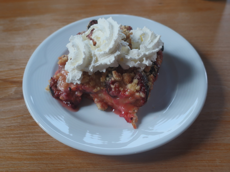 Ein Stück vom frischen Zwetschenkuchen mit Sahne. Der Kuchen ist noch warm, aber lecker.- Foto vom 27.08.2025